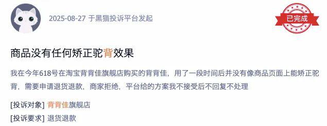 黑猫投诉平台上,多位用户反馈称,穿背背佳后"没有矫正驼背的效果"""停用后体态问题反弹""腋下被勒得疼""压迫肩背"。有消费者甚至表示,胸口被压得喘不过气,"后背没有支点,需要拉得很紧把背强行拉起来"。