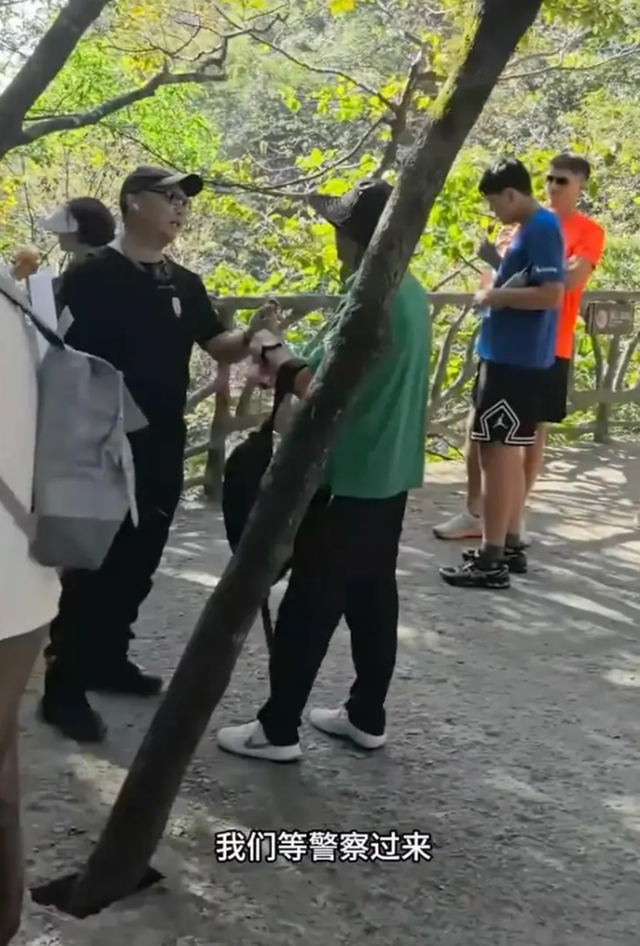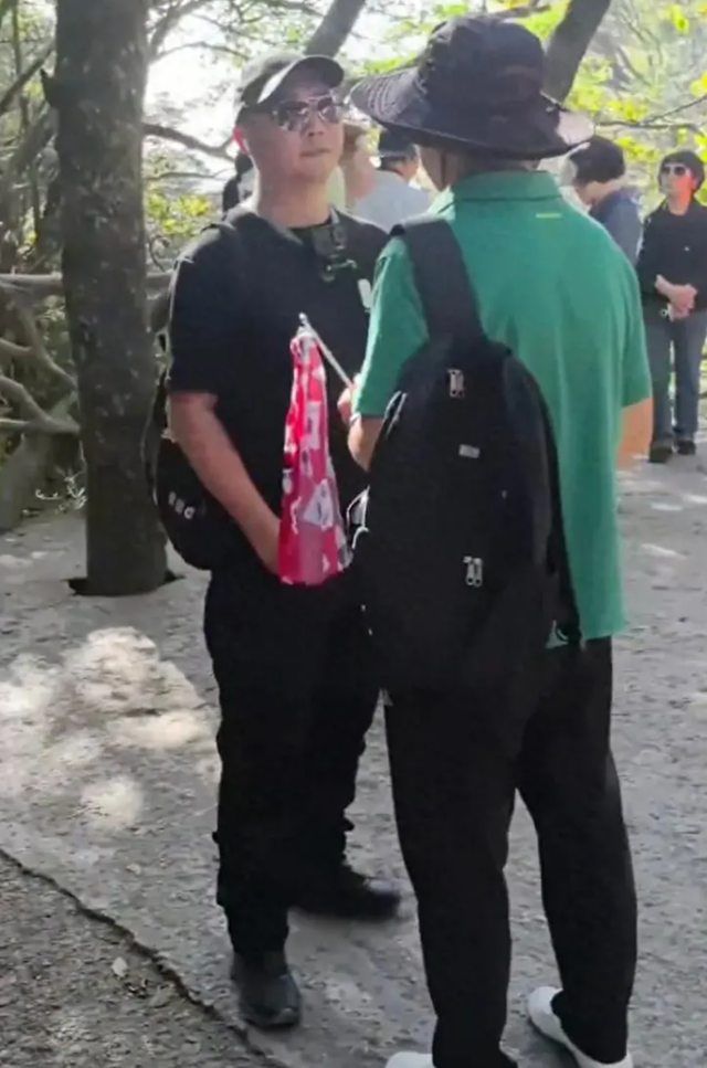 一名黑衣男子,以激昂的“爱国”姿态,阻止一名导游挥舞旗子集结游客。