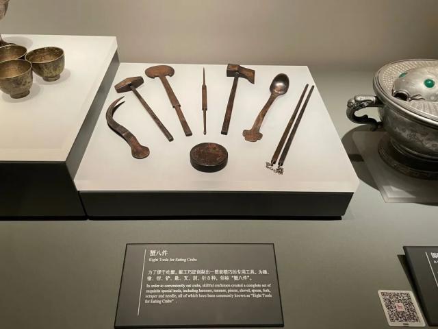 明代江南文人为吃大闸蟹,设计了"蟹八件",由八种小工具组成,包括腰圆锤、小方桌、镊子、长柄斧、调羹、长柄叉、刮片、针等,用来拆解蟹壳、剔肉和食用蟹黄。