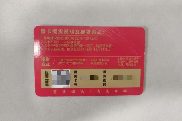 在这吃蟹的季节,许多人莫名其妙收到了一张邮寄来的蟹卡,蟹卡印刷精美,背后印有二维码盈丰财富,卡上宣称可以凭借这张蟹卡"提货"。