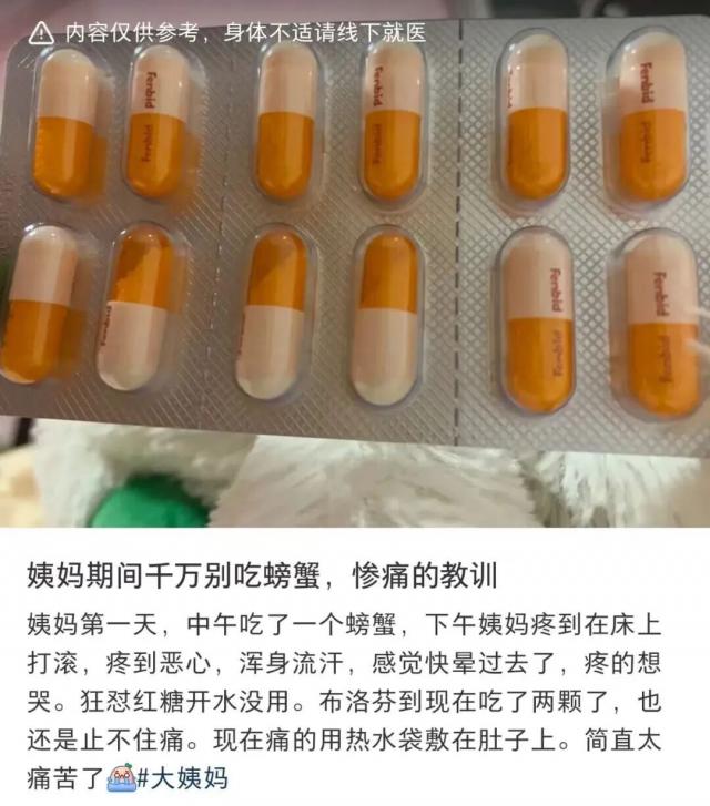有网友表示:"本来痛经都快被治好了,大姨妈前吃了俩螃蟹,再次体会到被一拳打肚子的痛。"